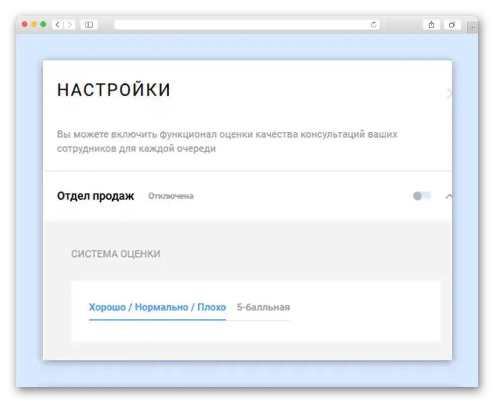Настройката на "Оценка на качеството" може да се извърши в личния кабинет "Телфин.Офис" (достъпно е включването и изключването на модула), там също се извършва избор на скала и се добавя аудиозапис в гласовото меню, съдържаща молба за оценка на качеството след приключване на телефонния разговор.
